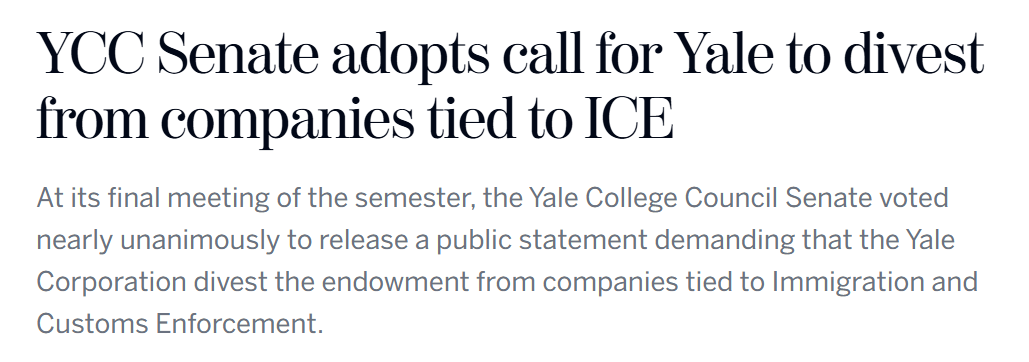 During the last YCC Senate session of the year, we both sponsored and voted in favor of a public statement calling on Yale to divest from all companies complicit in ICE’s terror operations, notably Palantir and Target Hospitality. As YCC President and Vice President, we will ensure this issue remains a priority during conversations with President McInnis and members of the Board of Trustees. Any cooperation with a federal law enforcement agency that inhumanely detains immigrants and kills American citizens is inconsistent with Yale’s commitments to our society and humanity.